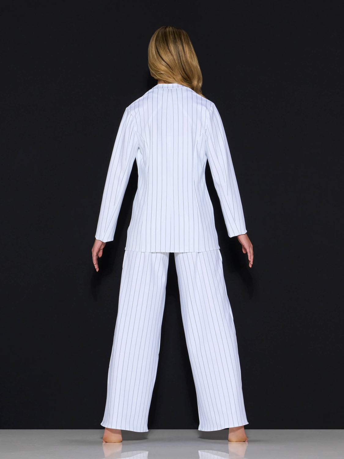 Pinstripe moisture-wicking lycra lapelless blazer with front snap closure. Front lined.